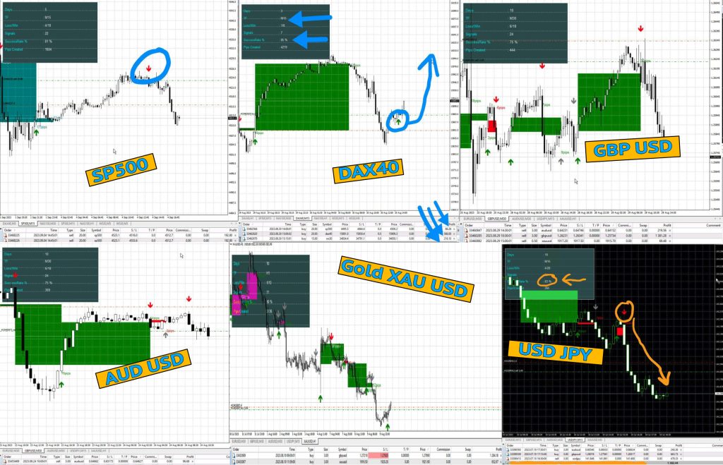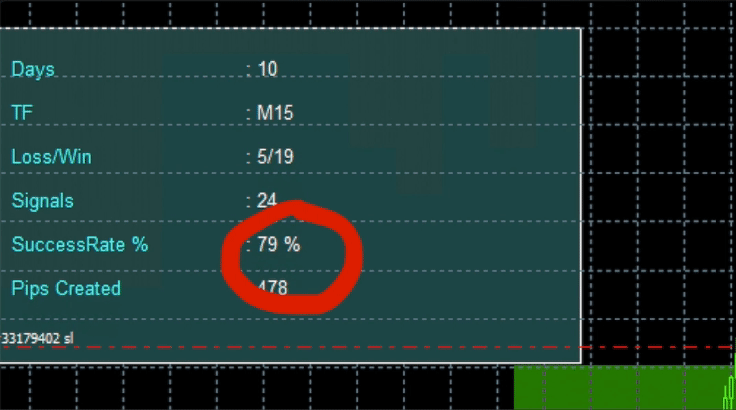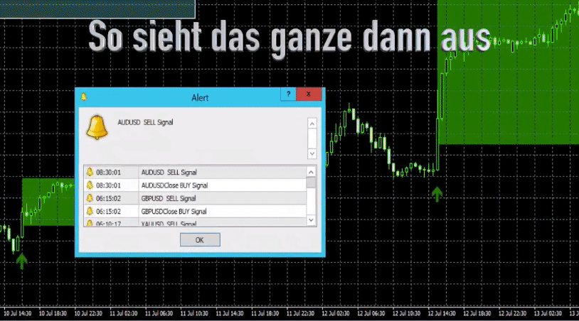 In der Grafik sind die Buy- und Sell-Signale durch die Pfeile genau erkennbar. Die grüne Box gibt Auskunft über die Gewinnhöhe, während die rote Box den Verlust anzeigt. Sowohl für den Einstieg als auch den Ausstieg erhältst du Benachrichtigungen.